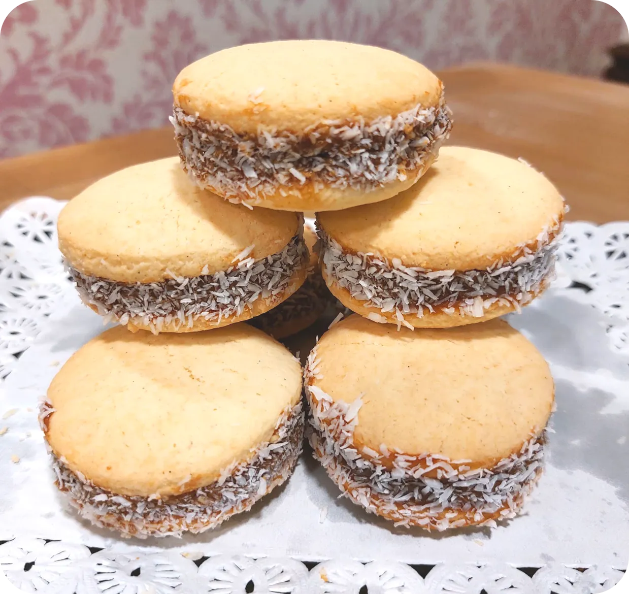 Tradicional dulce argentino. Galletas de almidón de maíz rellenas de dulce de leche y bañadas en coco. Sin gluten Se venden al peso