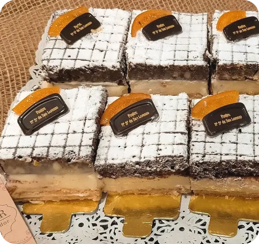 Exquisita base de hojaldre caramelizado con crema de naranja y bizcocho de chocolate y almendra, un bocado lleno de matices. Postre ideado por la Asociación de Confiteros de Valladolid con una historia de 25 años.