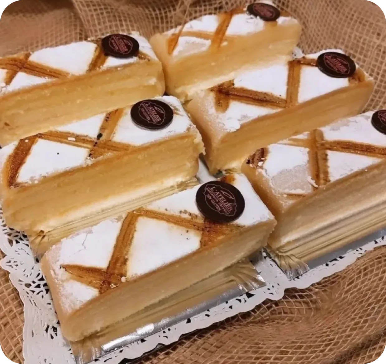 Tradicional tarta de Segovia con tres capas de bizcocho bañadas en yema, rellenas con dos capas de nuestra crema pastelera y recubierta por una capa de mazapán de almendra. Espolvoreada con azúcar glas con la superficie quemada.