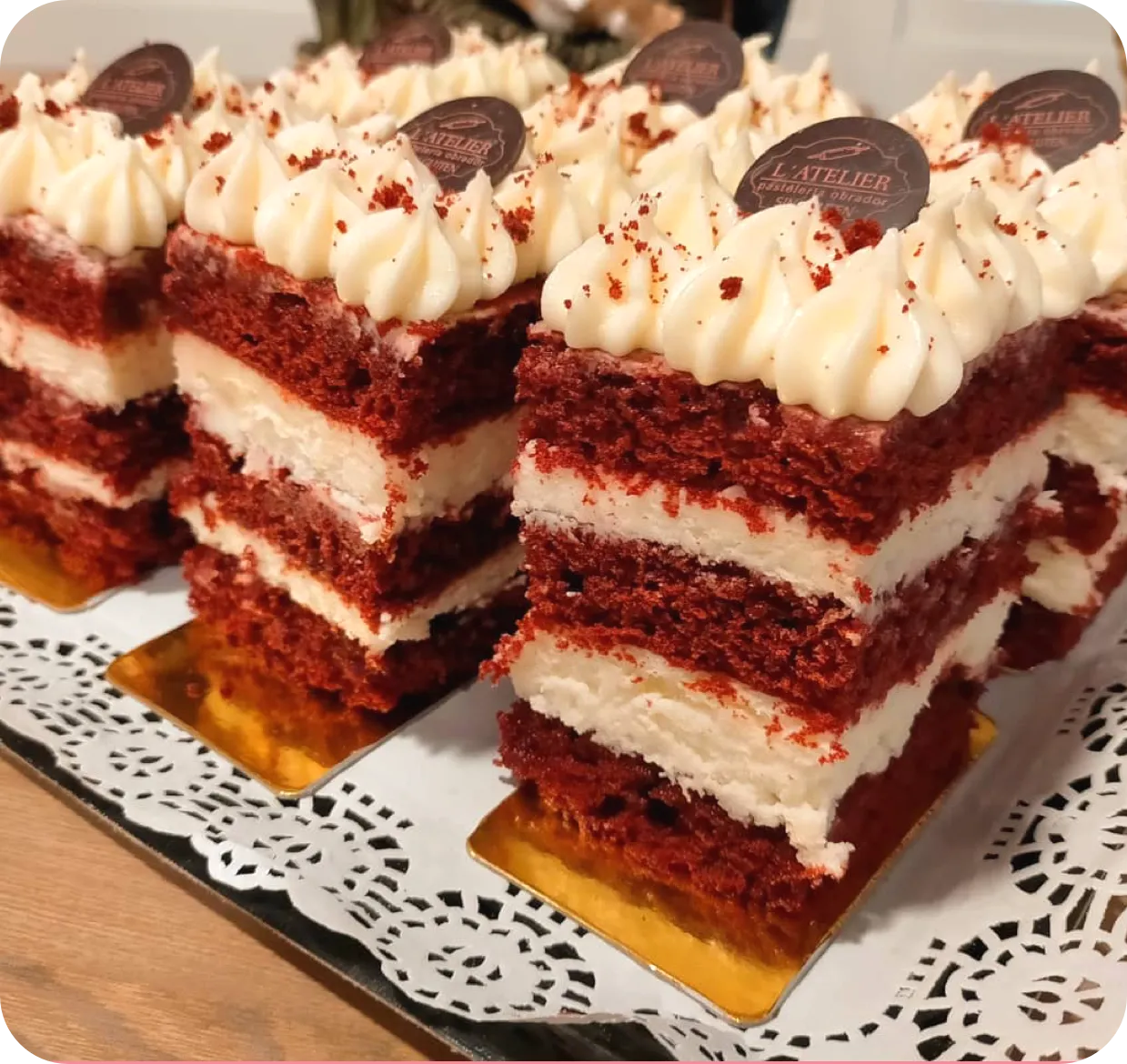 Preciosa tarta de color rojo de origen norteamericano y peculiar sabor a cacao. Se rellena y se cubre con una deliciosa capa de frosting de queso.